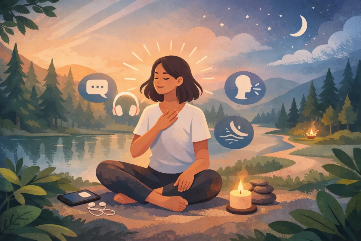We focus on everyday anxiety patterns like overthinking, panic-body moments, relationship spirals, health fear, work stress, and anxious nights. The product combines chat, voice, guided exercises, stories, and short self-checks so support is available in the format that feels easiest in the moment.